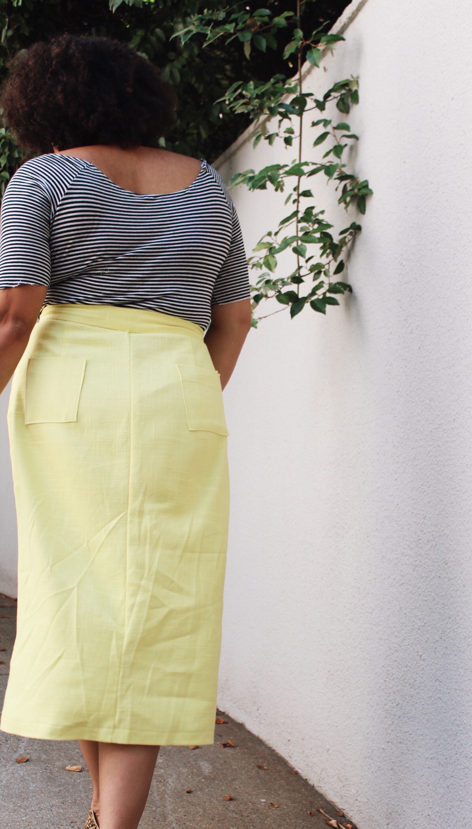 This is essentially a wrap skirt, with a button closure, no vent in the back (because you have one in the front, duh!). It has two darts in the back to help give it a nice shape around the bum with two pockets as well.