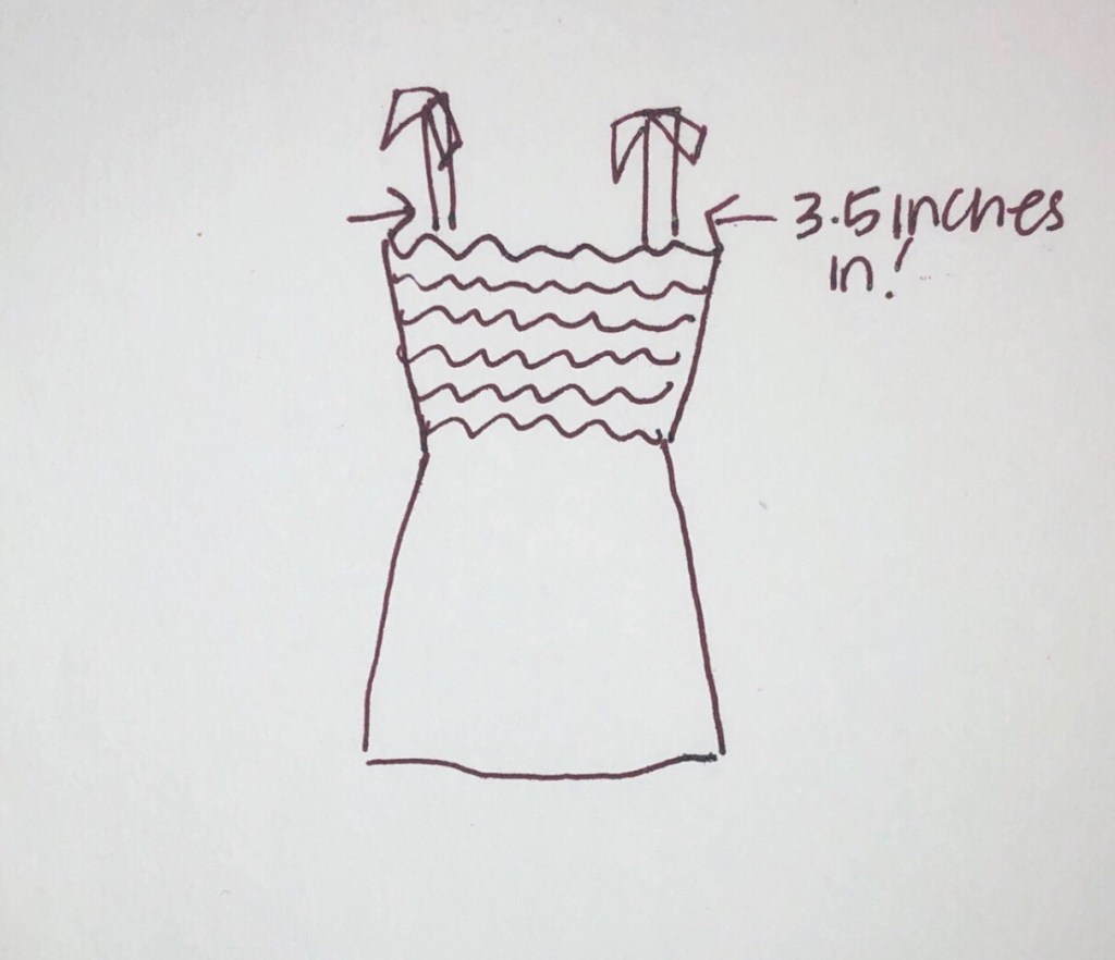 9. Attach your straps by centering the backseam allowance and attaching your straps 3.5 inches into your bodice sides. See the diagram below.