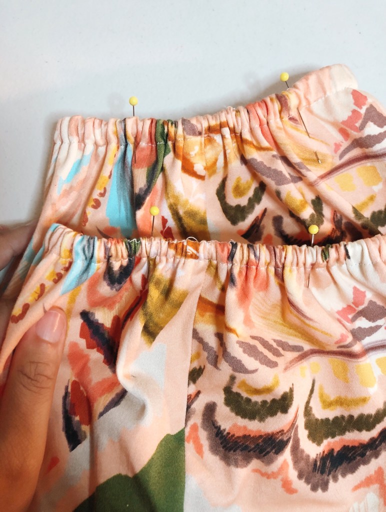 4. Right sides together sew your sleeves. Create your casing for your elastic on one end of your sleeve cap and feed your elastic in and close the casing.