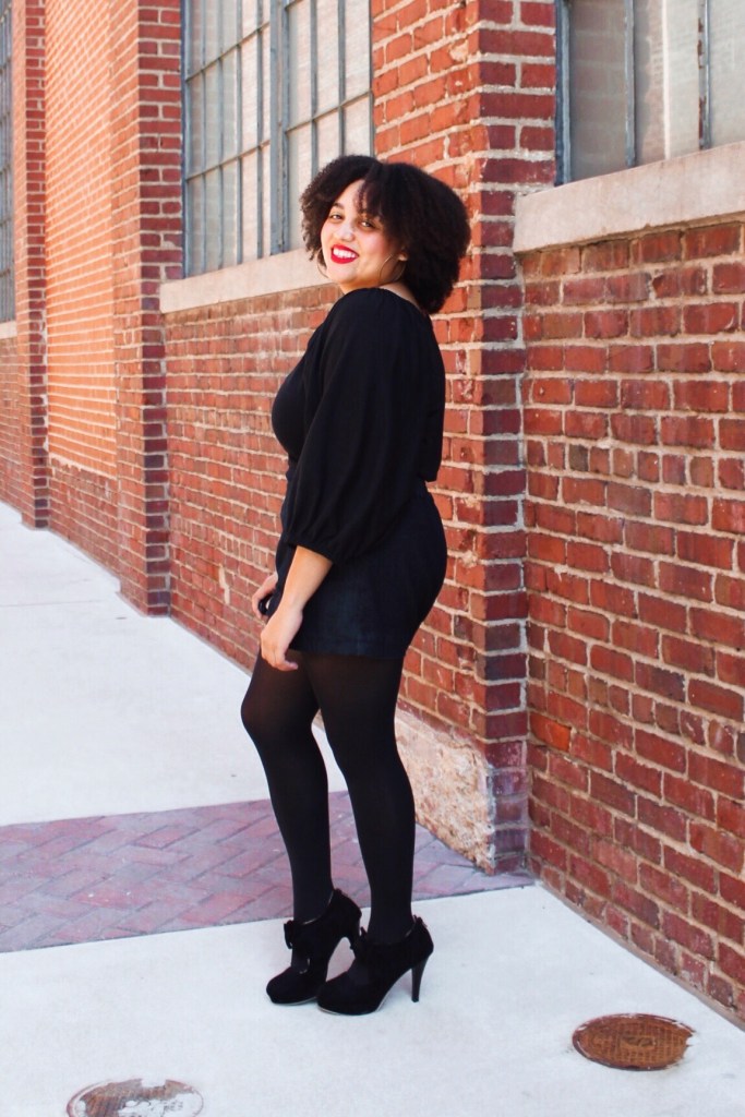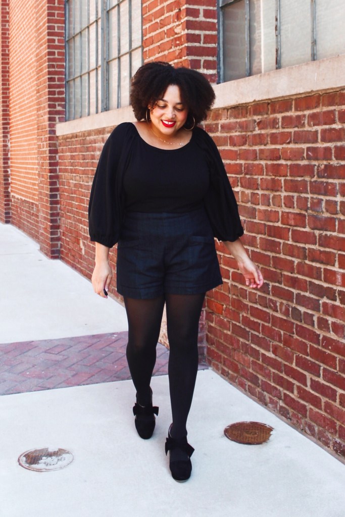 So I did a thing. I re-mixed my shorts so that they would also work in the Fall! I paired my shorts with a black version of the Adrienne blouse by Friday Pattern Company. I made this blouse in the Summer in a nice blue printed version. I had plans to make the black one in the Summer as well, but other projects got in the way.