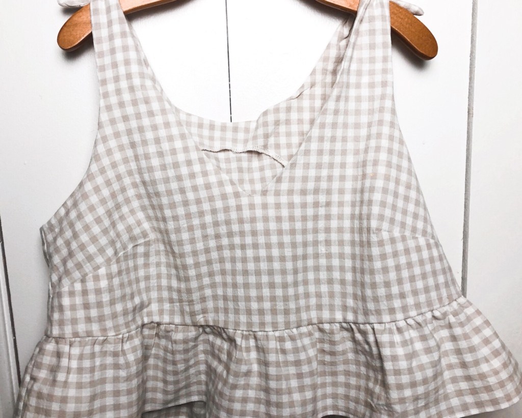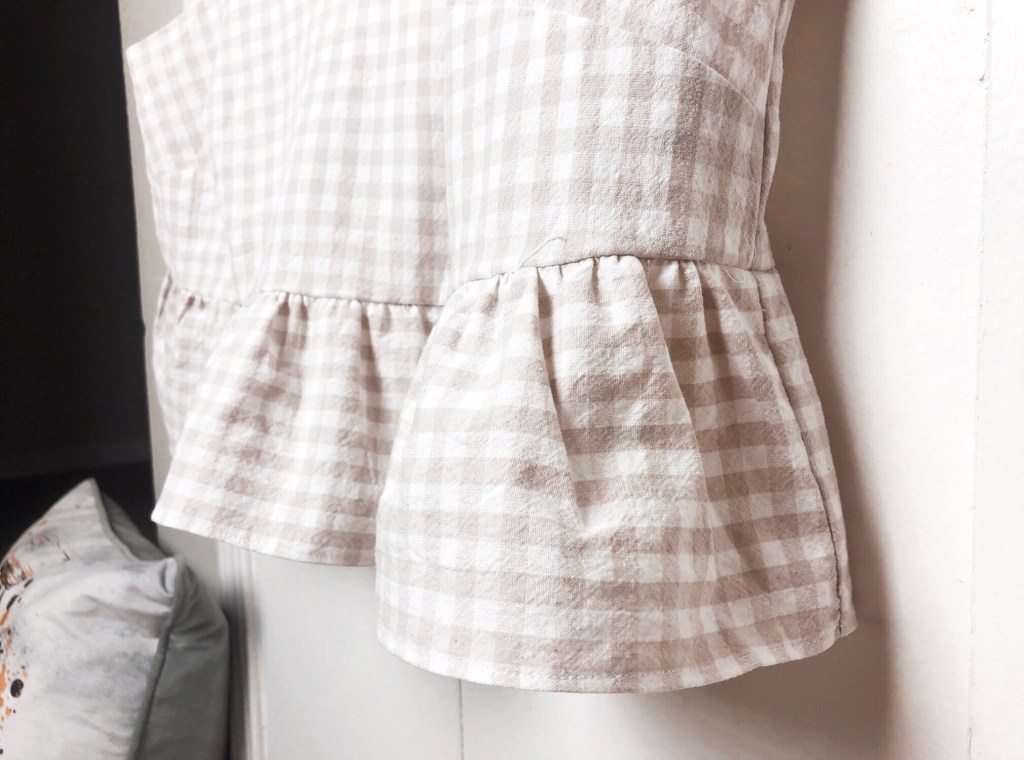 I used a combination of two views and used the shoulder ties and made a gathered peplum bottom with this neutral gingham fabric that I had in my stash. It’s a linen/cotton blend, which I think goes in line with the suggested fabrics for the pattern.