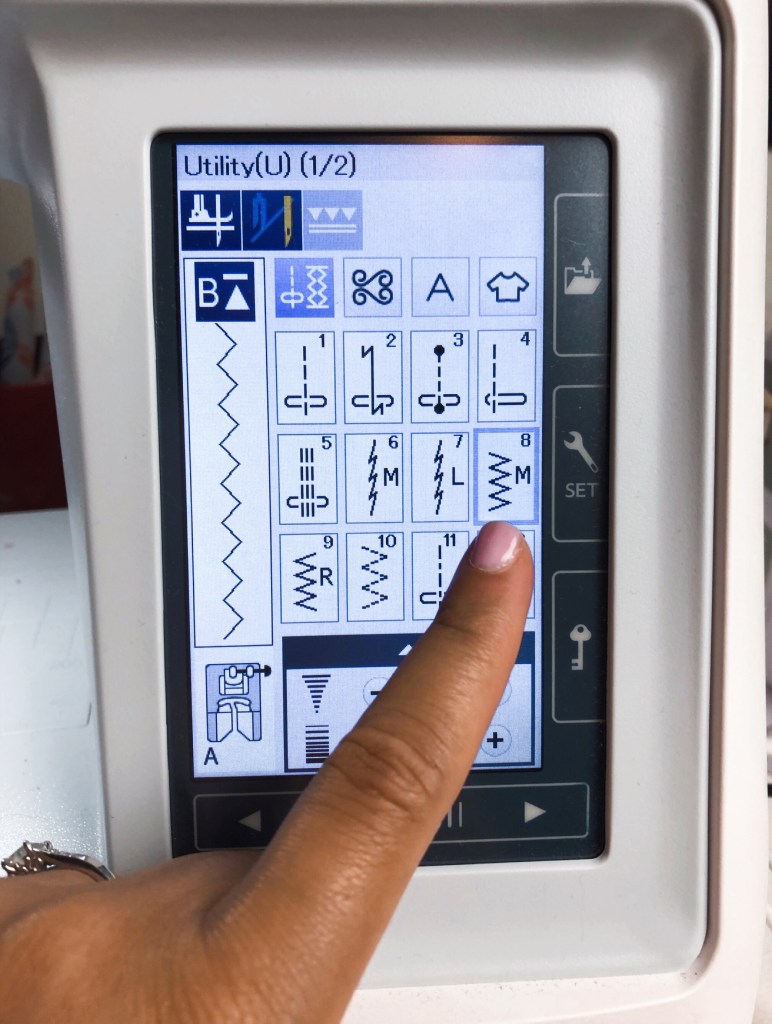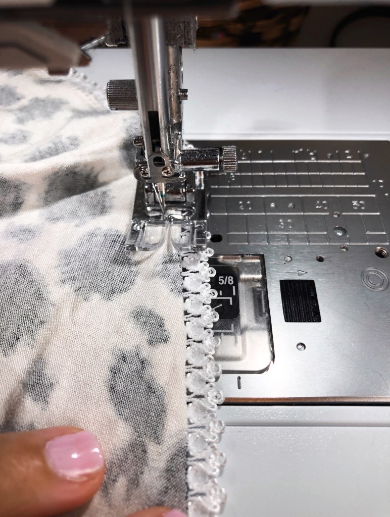 Using your zig-zag stitch on your machine you’ll need to add this piece to the waistband and the leg openings of your panties. I turned my panties so that the wrong side is showing (so I can make sure that my stitch is catching the elastic and the fabric) and I stitched all the way around my waistband and leg openings. You’ll want to be extra careful not to stretch your elastic or the fabric during this step.