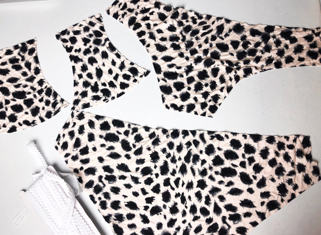 First cut out all of your pieces. You’ll need to cut 2 of your gusset. That’s the crotch piece. Sorry, there’s no other way to plainly say it, LOL. You can use the zig-zag stitch on your machine, but for this tutorial I used my serger. It’s completely up to you.