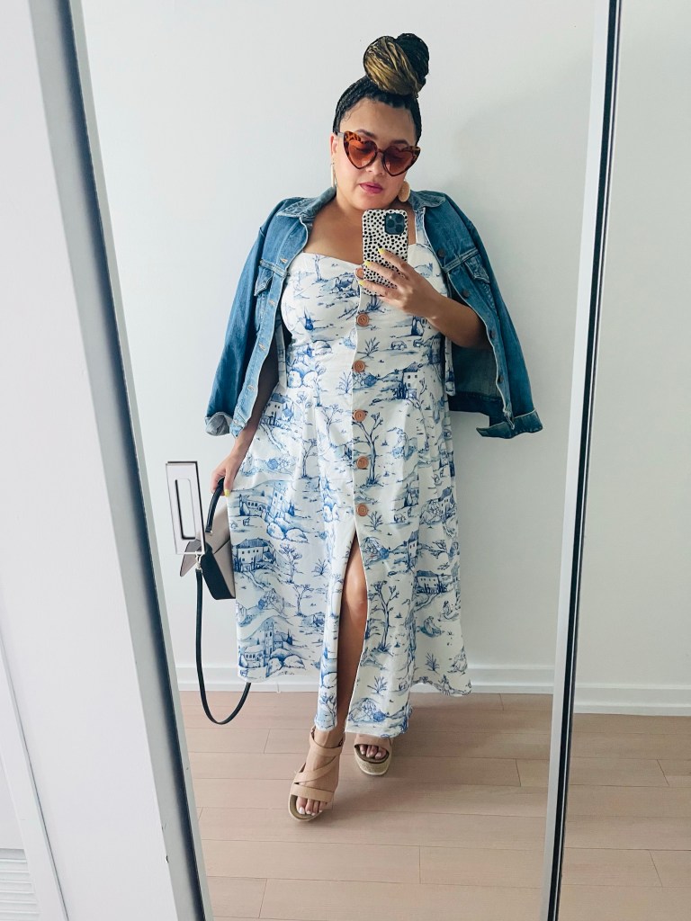 On Saturday I wore McCall’s 8177 to brunch and fabric shopping. I made adjustments for my height (removing about 4 inches total off the longest view). I also took in the bust a little bit. The fit was somewhat loose and I wanted a more fitted look. Lastly, although it’s hard to see… I added tie straps.