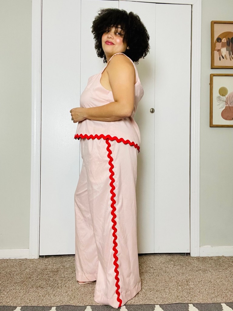 Next up, a lounge set featuring my new obession: ric rac trim. M8392 (top) and M7757 (pants) are made from a bedsheet set! I’ve had the bedsheets for over a year, purchased from the Goodwill for $5.