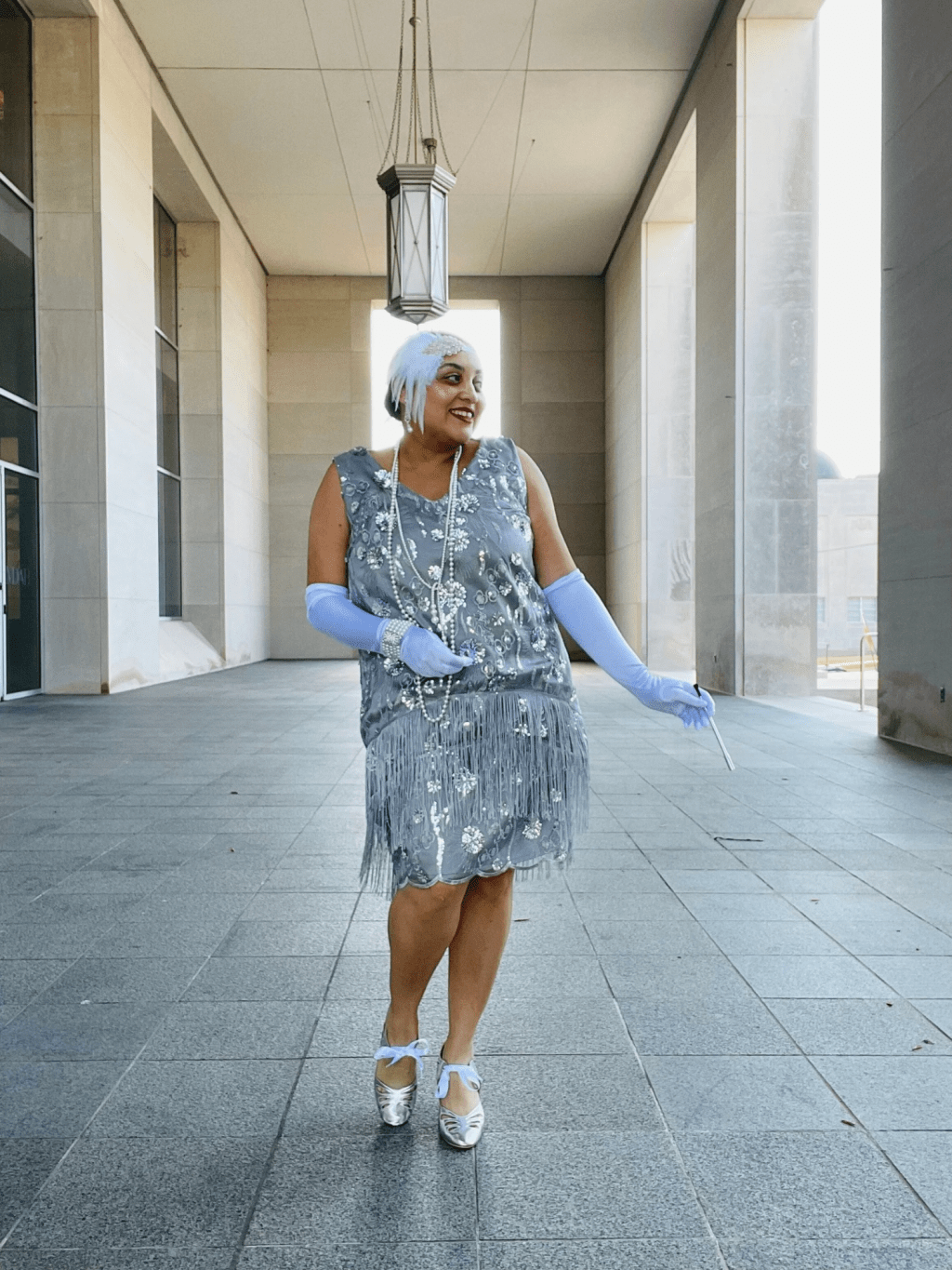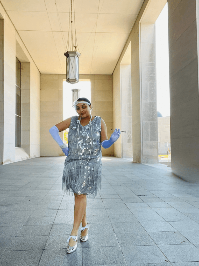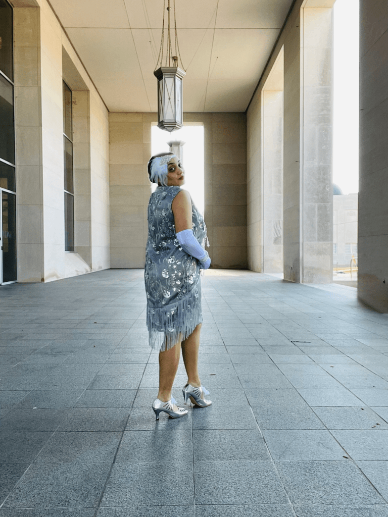I purchased Simplicity pattern S9088, which is a period costume. And I used this sequin mesh fabric over this silver polyester satin. I added 2 rows of fringe – and countless accessories. From the shoes, gloves and jewelry I left no stone unturned. I even did a side part, low bun and slicked down my big curly hair. I was committed to the role, honey!