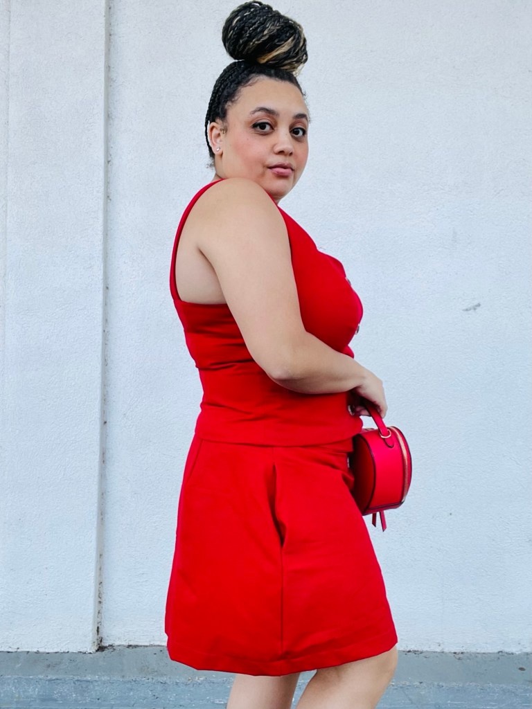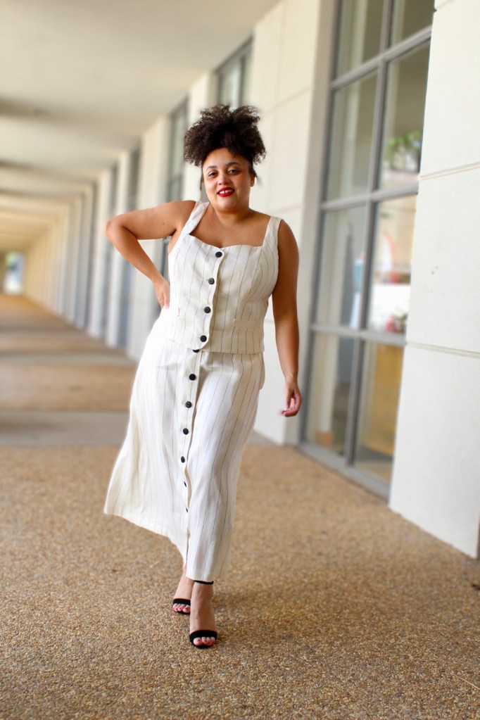So here’s a little about my pattern: It’s a matching top and skirt. The top is lined with princess seams, a sweetheart neckline, welt pockets and bust cup sizes A-D. The skirt is an A-line skirt that can be a mini or midi with a button front closure. It also features side pockets.