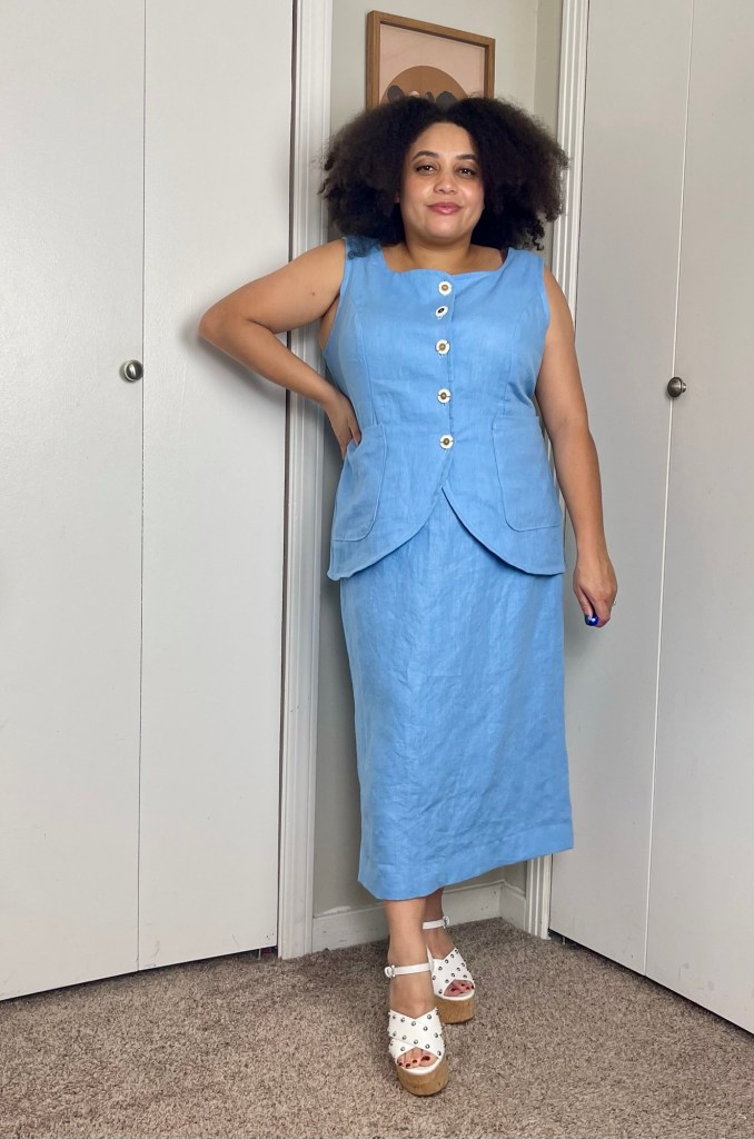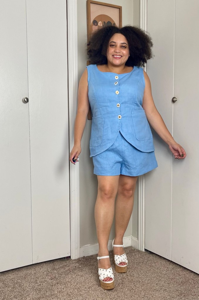 McCall’s 8585 is from the Summer McCall’s line and it includes the trendy jewel collar vest that has been everywhere. Plus a maxi skirt with an open split in the back and a pair of shorts.